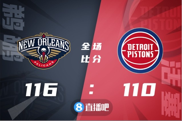 比赛上来,鹈鹕就率先进入状态取得场上领先,不过及时调整的活塞此后还是将比分追了上来,两队此后保持拉锯,次节中后段鹈鹕再次打出14-0的攻势拉开分差,半场结束时活塞落后9分;下半场两队开始陷入到胶着并打起对攻战,不过分差始终保持在十分左右,末节活塞虽然有反扑的势头但始终无法实现反超,最终鹈鹕116-110力克活塞拒绝连败。