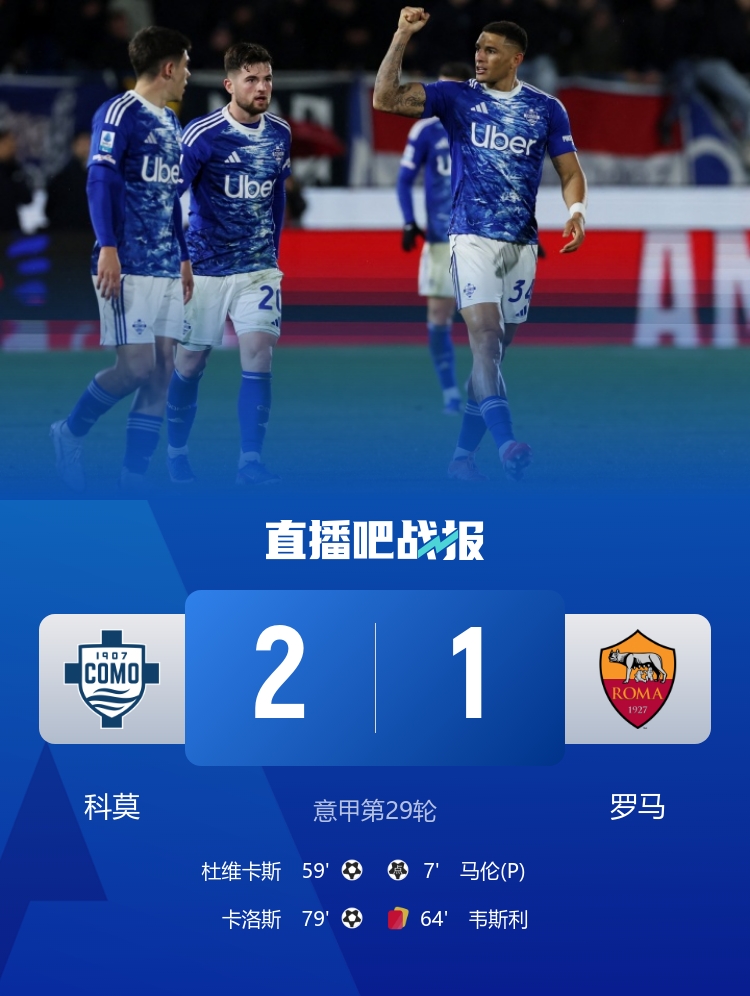 第78分钟,科莫反超比分!达库尼亚右路下底倒三角斯莫西奇推射被斯维拉尔扑出,第二点卡洛斯门前补射破门,科莫2-1罗马。↓