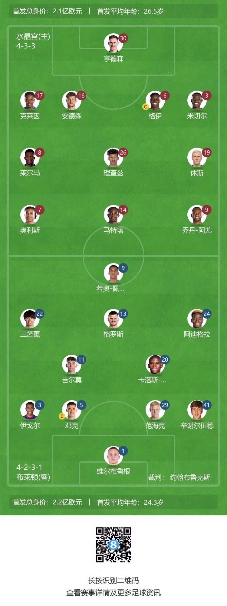 第19分钟,布莱顿左路斜长传打到禁区前,摆渡到后点,阿迪格拉的劲射!被迪恩-亨德森扑出↓