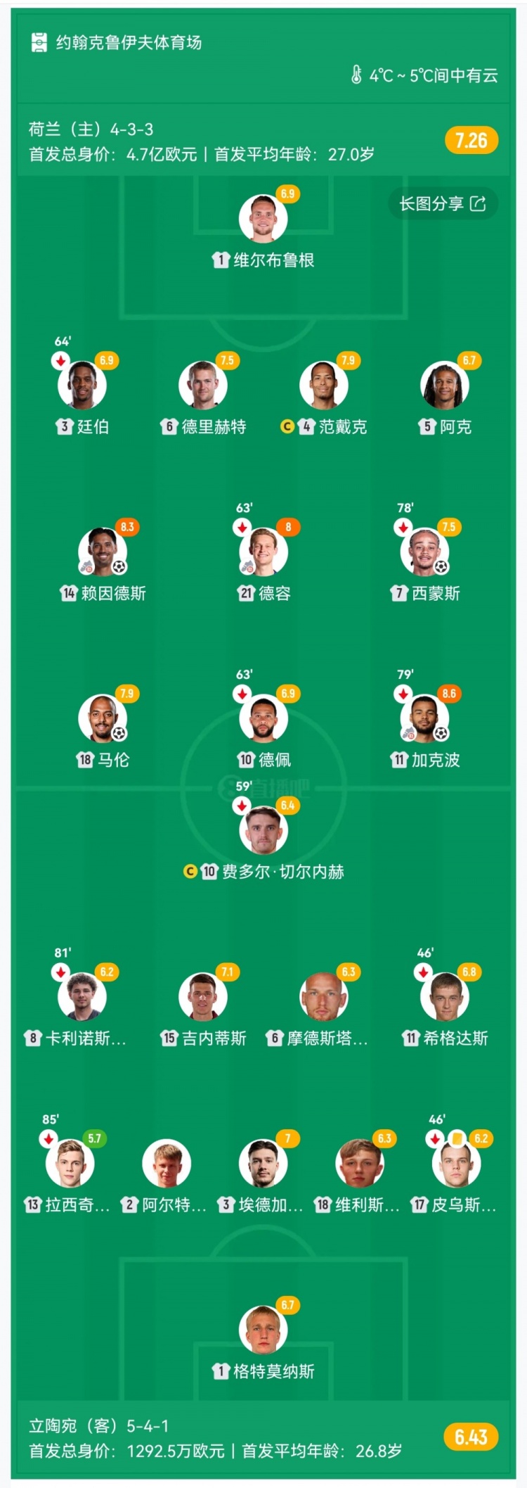 第62分钟,立陶宛角球被解围,荷兰快速反击,赖因德斯做球,马伦一条龙人球分过后破门!荷兰4-0领先↓