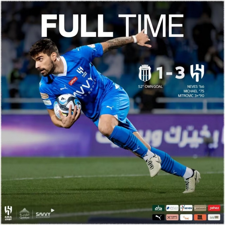 3月8日讯 北京时间3月8日22:00,沙特联赛第23轮利雅得新月挑战利雅得体育的比赛,上半场双方互有攻守,布努扑单刀,哈姆丹造点,米特洛维奇点射被扑出,下半场布莱希乌龙球,米特洛维奇造点,鲁本内维斯点射扳平,随后内维斯助攻迈克尔头球反超比分,补时阶段马尔科姆造点,米特洛维奇点射,最终利雅得新月3-1逆转利雅得体育追平27连胜的记录,新月12分领跑积分榜。