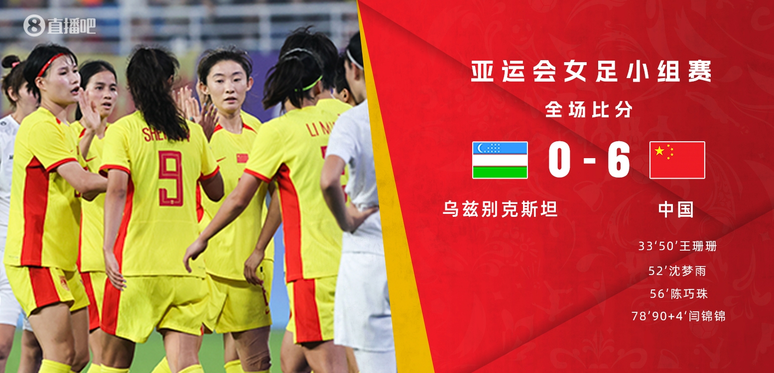 9月28日讯 北京时间9月28日晚19点30分,2023年杭州亚运会女足A组第3轮在杭州临平体育中心体育场展开角逐,中国女足对阵乌兹别克斯坦。上半场王珊珊头球破僵,下半场王珊珊再入一球,沈梦雨和陈巧珠扩大比分,闫锦锦替补梅开二度。最终中国女足6-0大胜乌兹别克斯坦,中国女足以A组头名身份晋级八强。中国女足两场攻入22球失0球,1/4决赛将对阵泰国。