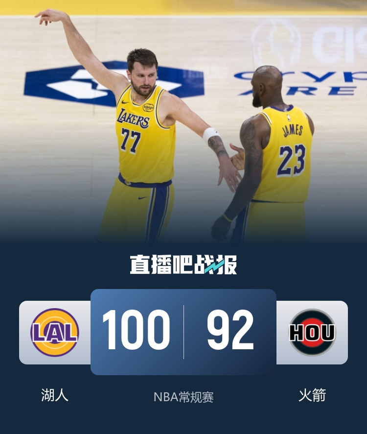 首节开打后小贾巴里、杜兰特和阿门轮番输出,火箭一度占优,但东契奇内外开花独取16分率队后来居上,首节结束时湖人领先1分,次节回来,两队你来我往比分紧咬,末段湖人进攻突然停滞,火箭延续火力一波8-2拉开比分,半场战罢,火箭反超6分。易边再战后火箭杀伤内线确立两位数优势,东契奇连投带罚率队追分,湖人三军用命回敬14-2再度领先,三节结束后湖人反超3分,末节决战,双方你来我往交替领先,决胜时刻湖人一波9-0确立胜势,最终湖人100-92力克对手豪取6连胜,同时守住西部第3。