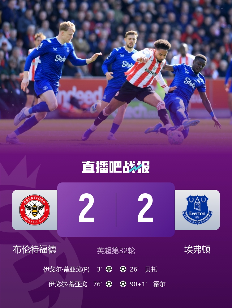 布伦特福德2-2埃弗顿 霍尔失单刀+91分钟绝平 伊戈尔·蒂亚戈双响